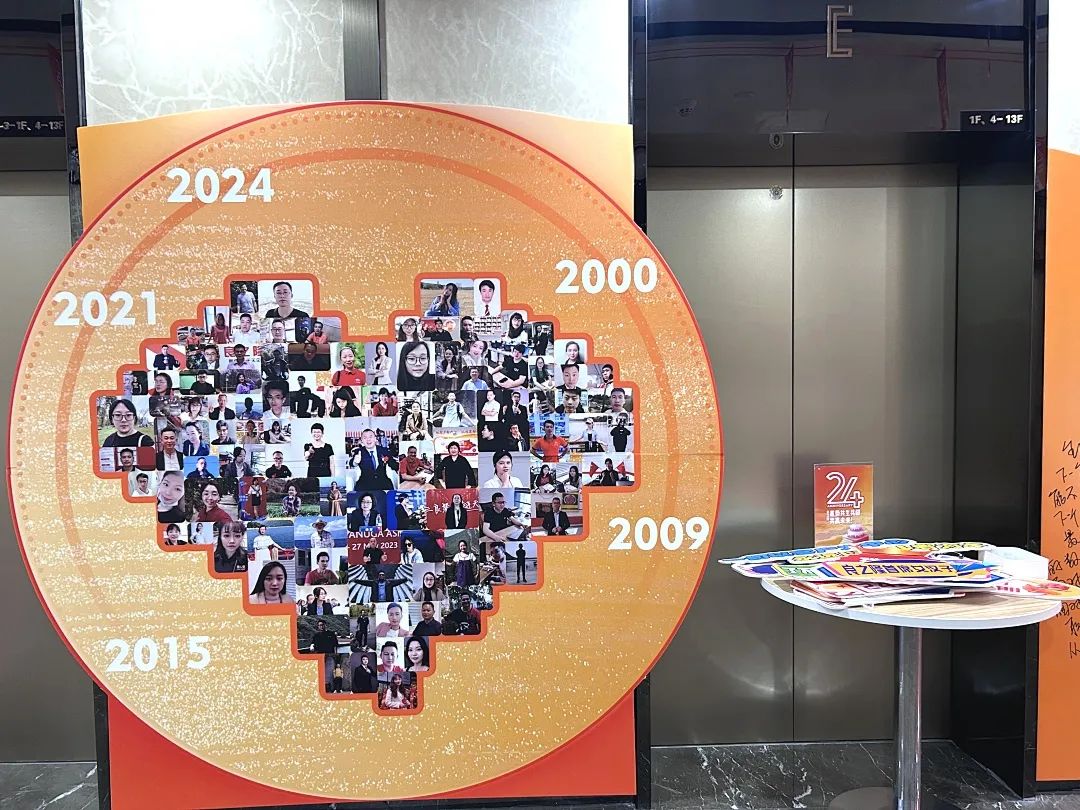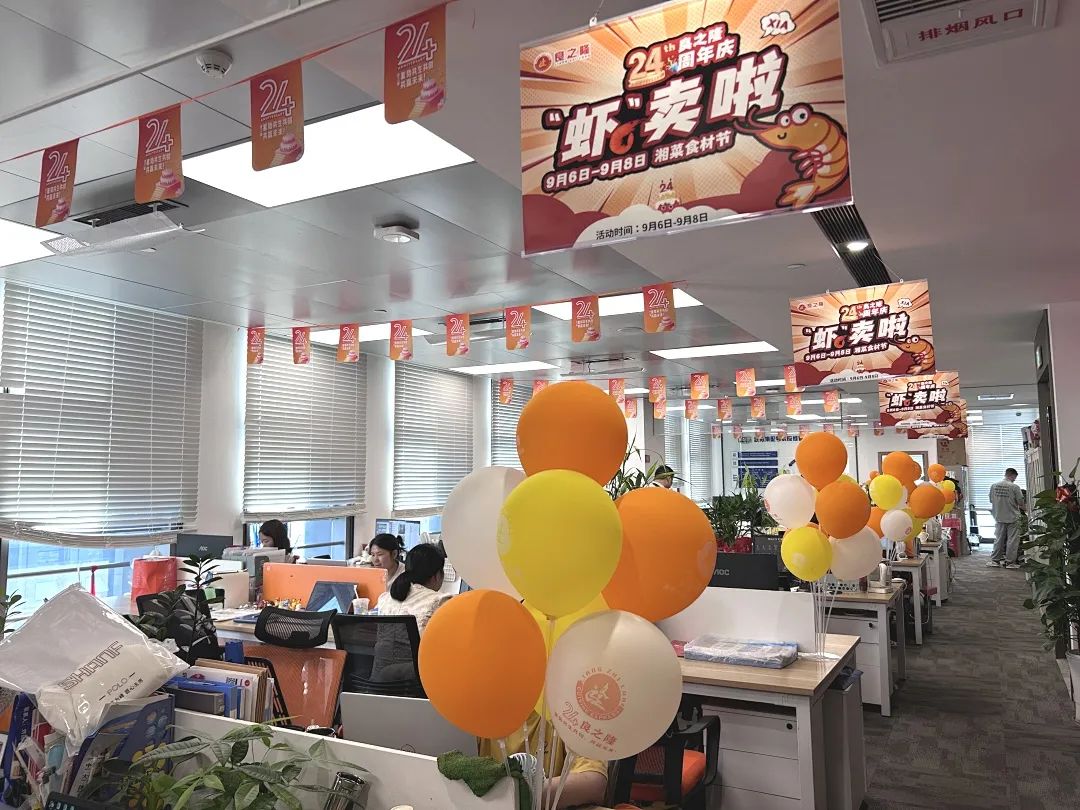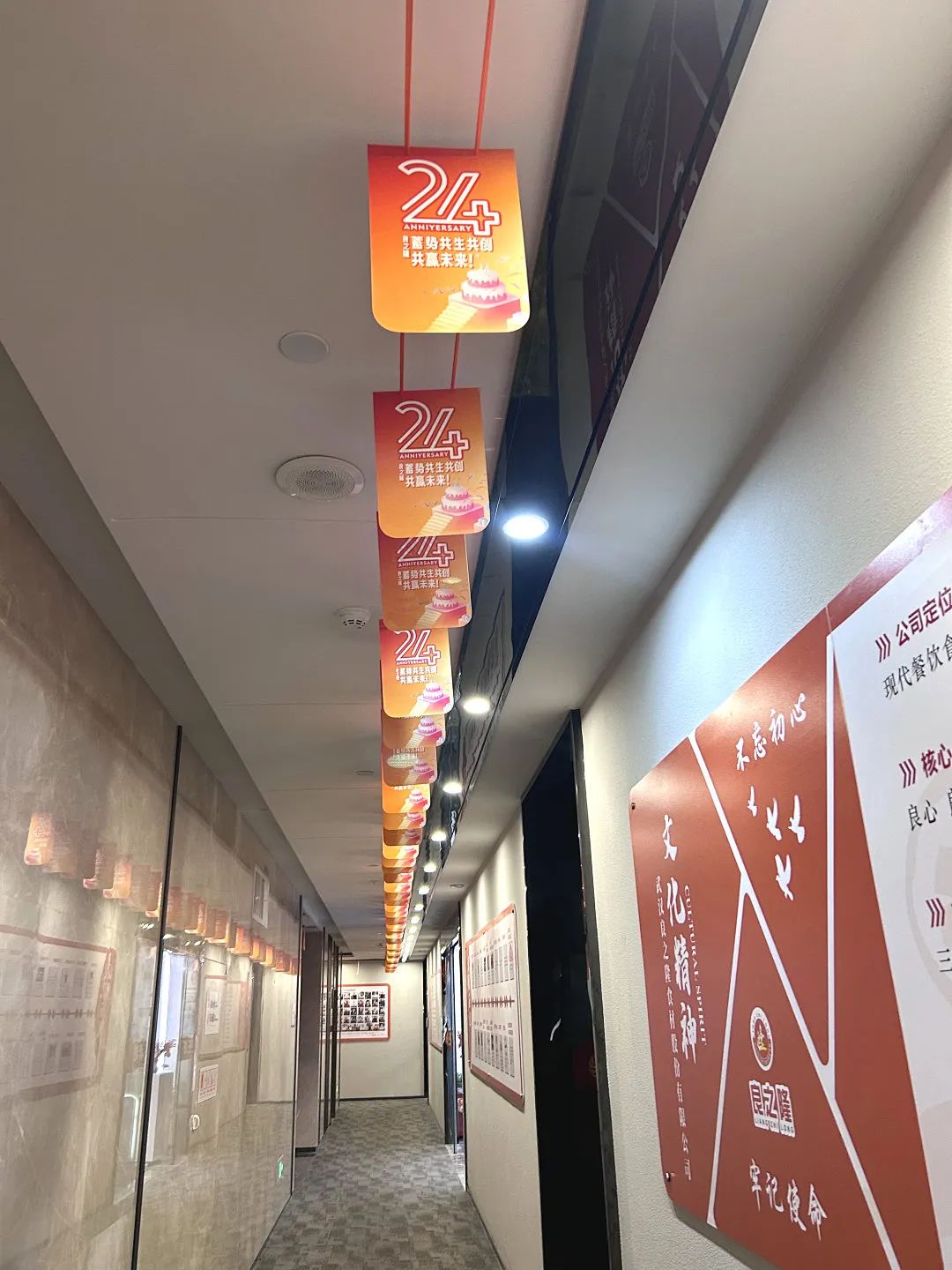 公司總部及全國各門店在公共區(qū)域、辦公場所精心布置,通過在門頭、前臺、中庭、辦公區(qū)域張貼24周年活動標(biāo)識、宣傳標(biāo)語、吊旗等方式,全面營造隆重?zé)崃摇⑾矐c活潑的慶祝氣氛。